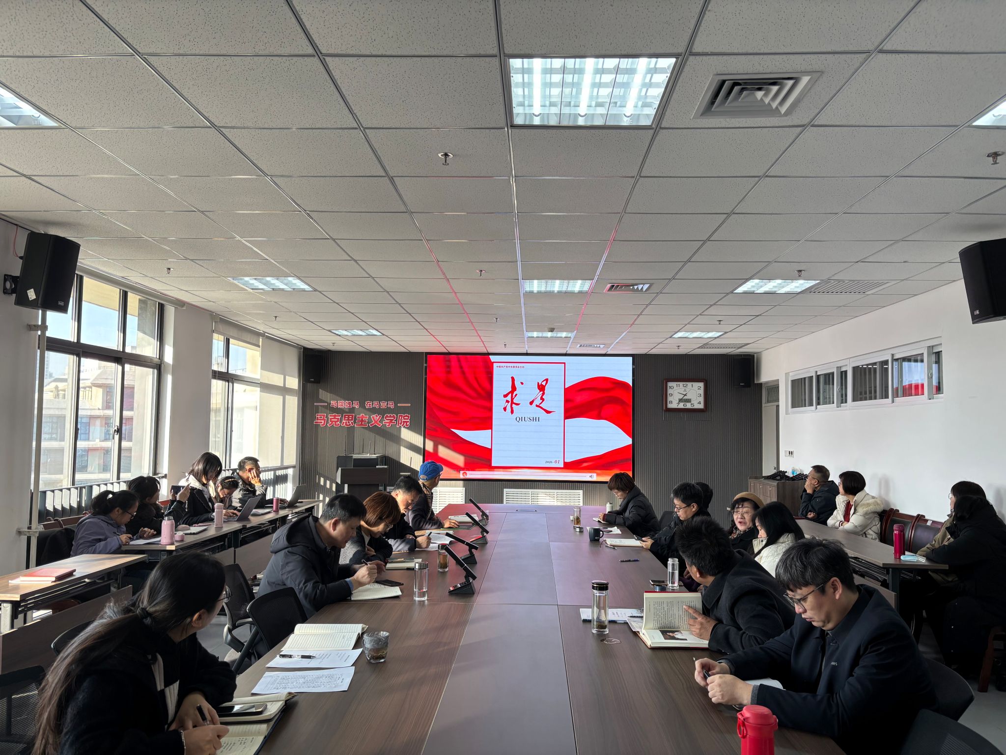 会议学习了习近平总书记2026年新年贺词。自2014年新年起,习近平总书记每年都会发表新年贺词。贺词以家、国、天下为价值坐标和实践逻辑,传播理念、凝聚共识、塑造形象、联通世界。一句句深情寄语、一个个温暖瞬间、一项项重大成就、一份份庄严承诺,将个人梦想、民族期盼与世界命运紧密相连,擘画出贯通个体、家庭、民族与人类的美好愿景。